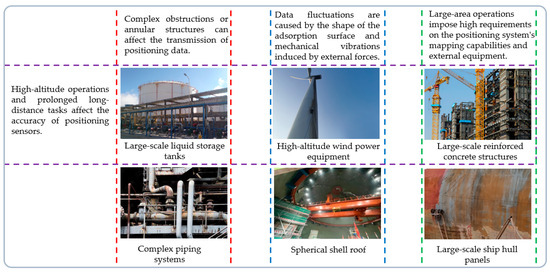 The primary spatial positioning methods include vision-based positioning, inertial navigation, magnetic field sensing, LiDAR, and multi-sensor fusion techniques. Figure 1 illustrates various complex operational scenarios, such as vertical ship hulls, cylindrical storage tanks, and uneven metallic surfaces, highlighting the demand for advanced spatial positioning systems that are capable of maintaining a high degree of precision in dynamic environments. The vision-based positioning method relies on a camera to capture environmental images, and feature matching and depth estimation are conducted to calculate the target location based on the image information [8]. The inertial measurement unit (IMU) is utilized in the inertial navigation method to obtain the measurements, which are used to estimate the position and attitude of the robot. Although its adaptive ability is strong, its inertial navigation suffers from accumulated drift errors [9]. The subtle change in magnetic field distribution is caught by a magnetic sensor to calculate the position of the robot on the metal surface. Although a magnetic sensor can be used in low-light environments, the positioning precision is limited due to magnetic field instability. LiDAR is also chosen as a kind of positioning method, but the positioning accuracy is greatly reduced in enclosed or highly reflective environments [10,11]. In recent years, vision, the IMU, and magnetic sensing have been proposed to improve overall positioning performance. Filter algorithms such as Kalman-type filtering, particle filtering, and correlation filtering are used to enhance positioning accuracy. However, the optimal fusion strategies of multi-sensor data remain a significant research challenge [12,13,14].