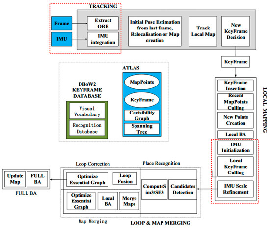 A LiDAR- and IMU-based tightly-coupled fusion was proposed by Zhou et al. [31] to enable the spatial positioning and map-building for quadruped robots. The failure problem arising from the unstable motion was addressed for the SLAM during the robot’s operation. The VI-SLAM was established by Liu et al. [32] based on mean filtering. The IMU data are preprocessed by mean filtering to eliminate random noise and angular errors. Then, the filtered IMU data integrated with visual information are selected as the input to SLAM to enhance the system’s robustness and positioning accuracy. Figure 5 presents the VI-SLAM framework, which integrates visual and inertial data streams. By fusing motion and image cues, VI-SLAM improves positioning precision in texture-rich environments while mitigating the drift issues that are often found in IMU-only or vision-only systems. An IMU- and binocular vision-based SLAM was proposed by Wang et al. [33] for indoor localization. The separated initialization was performed for the binocular vision and IMU, and the nonlinear optimization method was used to jointly remove visual and inertial constraints for achieving the fused results of the IMU and binocular vision data.