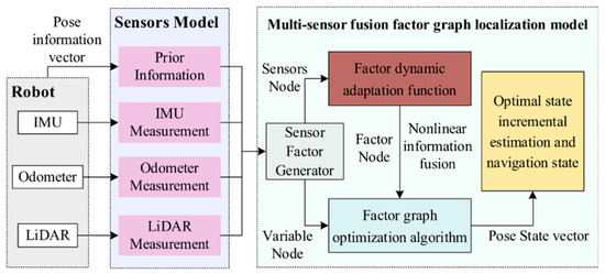 Significant progress has been made with the IMU-, camera-, and LiDAR-integrated multi-sensor fusion methods. As shown in Figure 6, Zhang et al. [34] proposed a factor graph-based multi-sensor fusion positioning method to improve the positioning accuracy and robustness of indoor mobile robots. The sensor-factor node models were constructed for the IMU, odometry, and LiDAR, and the factor graph theory was used to complete the data fusion. A multi-sensor fusion approach was developed by Zhai et al. [35] for the localization and mapping of two-wheeled inverted pendulum (TWIP) robots on approximate flat surfaces. The LiDAR, IMU, and odometry measurements were coupled through the factor graph, and the ground constraints and nonholonomic constraint factors were introduced to enhance localization accuracy. The multi-sensor fusion approach provides a novel solution for wall-climbing two-wheeled robots. An IMU/LiDAR/camera-based automatic calibration method was proposed by Liu et al. [36] and Hou et al. [37] to avoid manual annotation. An online temporal calibration method was further established by Liu et al. [38] to complete the multi-sensor fusion. The time-offset issues were addressed among the sensors, and the motion constraint model enhanced the calibration robustness. The motion accuracy was apparently improved for the robotic systems through the calibration-based multi-sensor fusion methods.