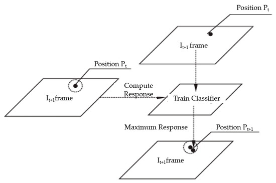 Correlation filtering belongs to the typical image-processing algorithms. The core principle of correlation filtering lies in training a filter that maximizes the correlation output corresponding to the target region within the acquired image. The core working principle of correlation filtering, as illustrated in Figure 8, involves maximizing the signal correlation between a predefined target and the current frame. This allows the system to maintain target lock, even in visually noisy conditions. An advanced correlation filtering method was proposed by Li et al. [45] to enhance positioning accuracy by integrating target prior information, multi-feature fusion, and adaptive model updates. He et al. [29] developed an improved correlation filtering algorithm to effectively suppress background noise interference and improve target positioning accuracy. Wang et al. [46] proposed a real-time robust correlation filter algorithm to obtain high-precision spatial positions under target deformation, scale variation, occlusion, and fast-motion scenarios. Wang et al. [47] developed a real-time target tracking algorithm based on correlation filtering. The target tracking accuracy was apparently improved through the effective separation of targets from background noise interference in high-speed motion scenarios. Yu et al. [48] proposed a robot-vision-based pedestrian avoidance control method. Benefited from the utilization of correlation filtering, the method achieved 98% tracking accuracy while maintaining real-time performance, according to the paper.