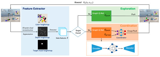 The DRL is also used to eliminate dynamic environment interference on the spatial positioning accuracy for magnetic climbing robots. A DRL-based highly efficient view planning algorithm was developed by Wang et al. [52] to obtain the optimal viewpoint for the detection of complex products. In the highly efficient view planning algorithm, a visibility estimation method was designed to obtain the visible areas under the given viewpoint quickly, and the asynchronous advantage actor–critic was used to solve the view planning problem. A graph-based DRL algorithm [53] was proposed to detect objects with coverings. The DRL model was established to effectively explore the occluded objects with a 100% success rate in the simulation scenario, and the grasping and pushing performance was improved for the robots, with a 90% success rate according to that paper.