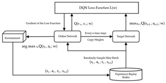 DRL-based spatial position prediction has received considerable attention. A DRL-based navigation method [49] was proposed by Zhang et al. to complete the detection and trajectory prediction of pedestrians. The YOLO algorithm was used to construct a semantic map for identifying interactive objects, and an attention mechanism-based trajectory prediction model was established to improve navigation efficiency. Through the introduction of an interaction penalty term in the reward function, Liu et al. [50] developed a visual interaction navigation method to reduce the energy consumption. Additionally, a spatial position prediction mechanism was employed to further optimize interactive decision making for the visual interaction navigation method. To obtain the optimized plan, an improved path planning method was proposed by Sivaranjani et al. [51] through integrating deep Q-networks (DQN) with the artificial potential field (APF). Compared with the traditional path planning method, the training speed and accuracy are enhanced for the improved path planning method. The structure of the deep Q-network (DQN) used for path prediction is presented in Figure 11. This model facilitates the learning of optimal control strategies through reward feedback, which is crucial for safe and energy-efficient motion planning.