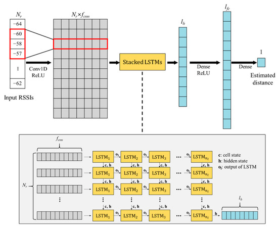 The CNN-based visual positioning algorithm was designed by Wang et al. [57] to achieve high-precision position based on image data. CNN was combined with the LSTM to reduce the impact of random noise on the positioning accuracy. The utilization of LSTM is helpful to decrease the number of training parameters and eliminate the overfitting issue. The CNN-LSTM-based indoor positioning method was proposed by Yoon et al. [58] to calculate the distance between the receiver and transmitter through the sequential received signal strength indicator (RSSI) data. During the model training of CNN-LSTM, a one-dimensional CNN was employed to extract local features from RSSI signals, and an LSTM network was used for capturing feature differences. As a result, the CNN-LSTM model is helpful in obtaining more accurate distances and improving indoor positioning performance. As shown in Figure 12, the CNN-LSTM network structure is effective for modeling time-dependent signal patterns, such as RSSI variations in indoor positioning. By combining spatial and temporal feature extraction, the model delivers improved positioning accuracy.