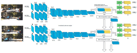 A deep learning-based visual–inertial odometry method (VINet) was introduced to fuse visual and IMU data. The CNN-RNN-based end-to-end training structure was employed in VINet to calculate the spatial position through the RGB image and IMU data. Further, a multi-rate LSTM was used to handle the high-frequency IMU data. Benefited from the joint training strategy, high-precision position estimates are obtained even in complex environments. Figure 13 illustrates the VINet architecture, which integrates CNN-RNN modules for processing camera and IMU data in a unified framework. This end-to-end system is capable of producing robust pose estimates, even in visually degraded or high-motion scenarios. Through the utilization of a neural network, a UWB-based indoor positioning method was proposed by Wu et al. [59] to enhance the positioning accuracy. The channel impulse response (CIR) data are automatically classified, and the CNN is combined with the attention mechanism to identify channel conditions and predict range errors. The calculated range errors are used to compensate for the distance measurements, and then the locations of unknown nodes are obtained through the weighted least squares algorithm.