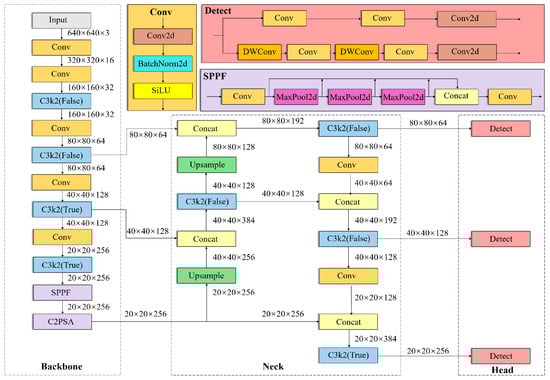 The SPPF module is a spatial pyramid pooling layer designed for extracting feature information at various image scales. Significantly, YOLOv11 incorporates the C2PSA module near the conclusion of the backbone. This module integrates cross-stage connectivity with spatial attention, hence enhancing the model’s ability to detect intricate scenarios. The neck structure adheres to the same framework as the feature pyramid network [28] (FPN) and Path Aggregation Network [29] (PAN) for the integration of feature information across various depths. The structure significantly improves the representation of multi-scale targets via an up–down bidirectional information transfer mechanism, particularly in small target recognition and complicated sceneries, resulting in more steady and accurate performance. The head component is tasked with integrating the feature information obtained from the backbone and neck for target categorization and positional regression. The detection head employs a decoupled design and integrates Depthwise Separable Convolution [30] (DWConv) to enhance efficiency and efficacy. The detection head separates the classification and regression branches to independently acquire category information and location features, thereby minimizing mutual interference among various tasks.