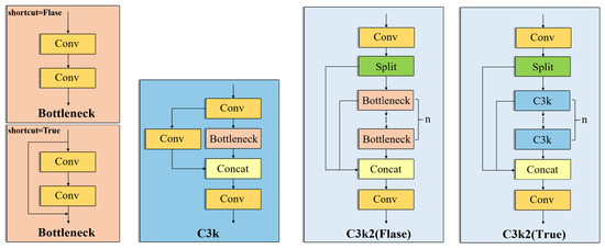 The structure diagram of bottleneck, C3, C3k2. C3k2 (False) means using the bottleneck module, C3k2 (True) means using the C3 module.