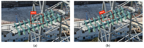 In traditional target detection tasks, a Horizontal Bounding Box (HBB) is commonly used to label and regress the location of targets. Although this method is widely used and relatively simple in data annotation, when the detection target background is complex or dense, for example, the insulator strings in the process of electric power inspection often have obvious directional and non-horizontal distribution characteristics, this makes the HBB often contain too much irrelevant background in the labeling of this type of target or contain overlapping other targets in the labeling, resulting in the decline of the detection accuracy and inaccurate localization. Gottschalk [31] and others proposed the OBB-Tree framework, which lays the foundation for subsequent rotating target detection. In YOLO detection, we adopt the Oriented Bounding Box (OBB) mechanism, which uses rotated box labeling when labeling to achieve an accurate description of the actual shape of the target. As illustrated in Figure 3, the OBB method exhibits a closer alignment with the geometric configuration of the actual insulator self-explosion defective target than the traditional HBB method. This alignment effectively diminishes background interference and is adept at recognizing small targets with varying orientations or overlapping presence.