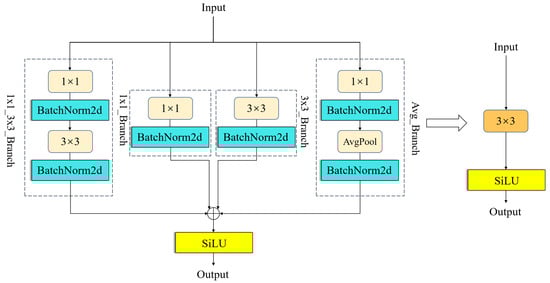DBB [33] is a structural enhancement module that derives its core idea from structural re-parameterization, first proposed in RepVGG [34]. Structural re-parameterization seeks to enhance model performance without augmenting inference delay by reconfiguring the network architecture to exhibit distinct representations during training and inference phases. This is demonstrated by integrating many convolutional layers to create a multi-branch architecture during the training phase. The multi-branch architecture is restructured during the inference phase into a 3 × 3 convolutional layer. This method streamlines the inference process while augmenting the model’s expressive capacity via a complicated structure throughout the training phase.