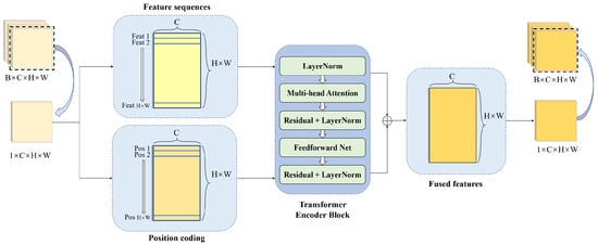 where represents the position encoding, signifies the kth channel in the dimension, and indicates the overall dimension of the position encoding. Subsequently, the two types of codes are transmitted together to the TransformerEncoder Block, which is sequentially processed through five layers, namely LayerNorm, Multi-head Attention, Residual + LayerNorm, Feedforward Net, and Residual + LayerNorm, to obtain a fused 2D feature map, and finally, after reshaping operation, the dimensions B × C × H × W are restored to form a new fused feature.
