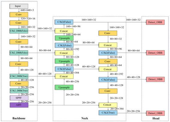 - To augment the model’s detection capability for diminutive targets, a supplementary small object detection layer (SODL) is incorporated into YOLOv11s, which amalgamates shallow and deep features to enhance the emphasis on small target characteristics. Additionally, the rotating target detection head (OBB) is devised in the HEAD section to refine detection efficacy for small-sized targets.