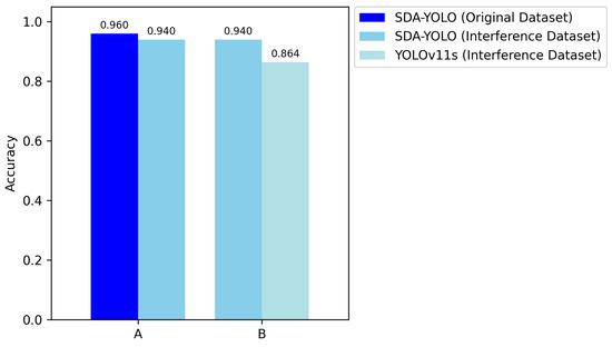 Comparison of detection accuracy under different conditions. Column A represents the detection accuracy of the SDA-YOLO model under both original and interference conditions. Column B represents the detection accuracy of SDA-YOLO and YOLOv11s models under interference conditions.