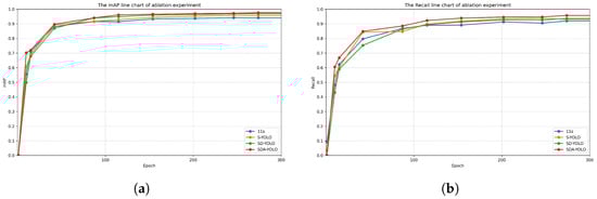 The mAP and R curves of different models in the detection process of insulators and self-explosion defects. (a) The total mAP curve. (b) The total R curve.