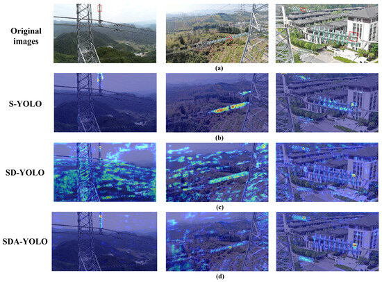 Figure 10 illustrates the comparison of heatmaps produced by the S-YOLO, SD-YOLO, and SDA-YOLO models on the test images. The heatmaps indicate that the S-YOLO model effectively identifies insulator self-explosion defects, yet it inadequately concerns specific small-sized targets; the SD-YOLO model pays more attention to small-sized self-explosion defects than the S-YOLO model, but also pays attention to irrelevant backgrounds. Conversely, the SDA-YOLO model not only pays the highest attention to small-sized self-exploding defects but also greatly reduces the attention to irrelevant backgrounds. The results indicate that our ablation tests are practical, demonstrating that the SDA-YOLO model possesses superior feature extraction and target localization capabilities, enabling more precise identification of the insulator’s self-explosion defect area with external interference.