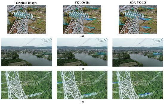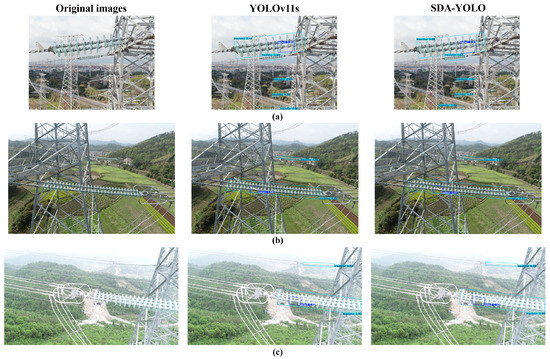 (a–c) represent three sets of insulator inspection images of transmission lines in different background environments with obvious insulator self-explosion defects. The first column is the three original images, the second is the YOLOv11s model detection result image, and the third is the SDA-YOLO model detection result image.