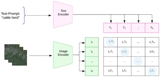 This paper explores the next frontier in deep learning approaches to satellite imagery remote sensing where LVLMs are applied. The diagram in Figure 1 below depicts the key concept for CLIP, where images and text descriptions are mapped into a shared embedding space. A batch of images (e.g., satellite images of cattle herds) is processed by an image encoder to produce image embeddings {I1, I2, …, IN}, while the text descriptions pass through a text encoder, yielding text embeddings {T1, T2, …, TN}. Using contrastive loss, CLIP maximizes similarity for correct pairs (diagonal entries like I1T1, I2T2) and minimizes similarity for incorrect pairs (off-diagonal entries like I1T2). This cross-modal contrastive learning allows CLIP to generalize well across domains, including remote sensing.