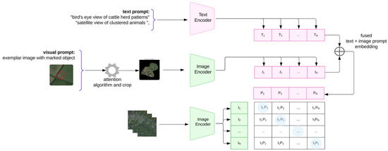Traditional CLIP architectures rely solely on text prompting for zero-shot classification, which presents fundamental limitations for remote sensing applications where objects like cattle herds are (1) spatially distributed with complex geometric patterns, (2) difficult to describe comprehensively in text, (3) visually distinctive when proper exemplars are provided. Utkarsh Mall et al. [23] highlighted this challenge and proposed Ground Remote Alignment for Training (GRAFT), which used ground images from Flickr to construct VLMs without textual annotations. Our proposed Enhanced-RSCLIP addresses these limitations through a dual-prompt architecture that combines textual descriptions with pre-processed exemplar images which are manually annotated with a red outline focusing on reference objects.