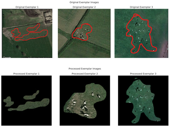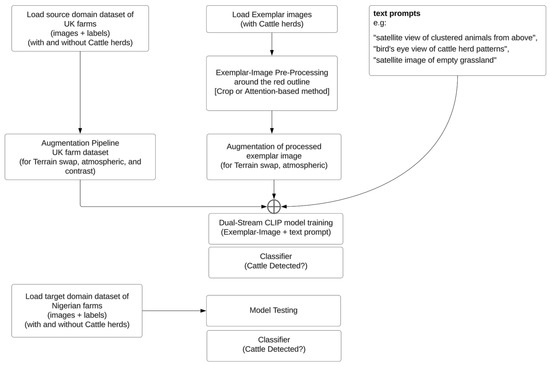Also, for the exemplar images, which contain manually annotated cattle regions outlined in red, an image preprocessing and augmentation process was applied. These exemplars serve as visual references for the model during training. By applying the same terrain transformation augmentations to these exemplars, the model’s reference points are adapted to match the target domain characteristics, ensuring that the feature prototypes learned during training align with the visual conditions expected during deployment in Nigeria. This synchronized augmentation ensures that both the training images and exemplars evolve together to bridge the domain gap, enabling seamless transfer learning across geographies, as demonstrated in Figure 5.