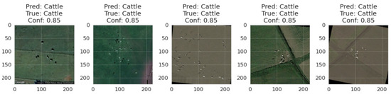 This overconfidence phenomenon suggests that while our dual-prompt architecture improves detection accuracy, the model may not adequately capture prediction uncertainty, particularly when generalizing across different geographic domains and terrain types. Figure 10, shows prediction samples across different terrain types, the analysis includes true positives with varying confidence scores (0.79, 0.84) for successful cattle detection in rural and barren terrains. False positives were also recorded demonstrating overconfidence issues in urban environments. This limitation highlights a critical area for future investigation through meta-learning frameworks, as discussed in Section 6. The enhanced-CLIP model integrated within the ProtoMAML (Prototypical Model-Agnostic) framework could potentially address this overconfidence issue by learning the optimal uncertainty quantification strategies across diverse geographic domains.
