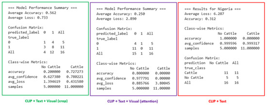 When applied to a random farm in the Netherlands with cattle herds, the model correctly predicted the presence of cattle herds, hence showing encouraging results on test domains with similar features as the source domain where cattle herds were observed on green pastures or farmlands. Figure 7 above shows some model performance metrics obtained during the evaluation of the CLIP variations.