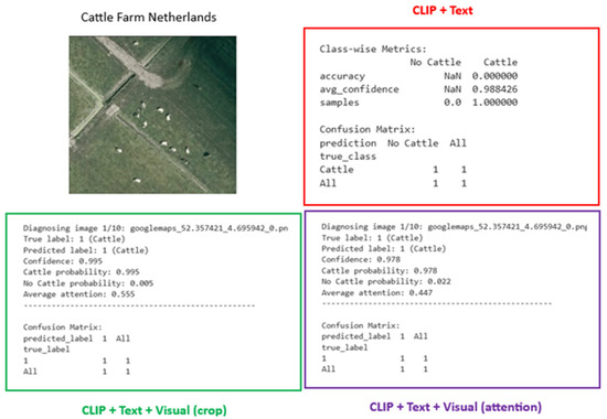 The best performing model framework used cropping to preprocess the exemplar images for the CLIP + text + visual prompt architecture, producing predictions of both “Cattle” and “No-Cattle” classes, achieving an accuracy of 0.72 in predicting the presence of cattle and an overall accuracy of 0.562 for both-class prediction. When applied to a random farm in the Netherlands with cattle herds, the model also correctly predicted the presence of cattle, as shown in Figure 8.
