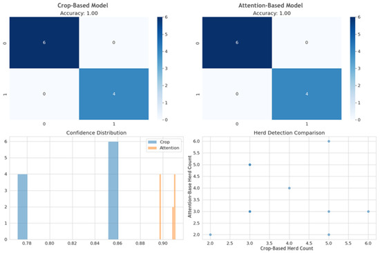 Training metric comparison between crop-based and attention-based exemplar processing algorithms. (Top row) Confusion matrices showing that both models achieve 100% accuracy on validation data, with true labels (y-axis) vs. predicted labels (x-axis). (Bottom left) Confidence score distributions revealing that crop-based processing generates more concentrated predictions (0.84–0.86) while attention-based processing shows wider variance (0.80–0.90). (Bottom right) Scatter plot demonstrating strong correlation between methods’ herd detection capabilities, with consistent performance across the 3–5 herd count range.