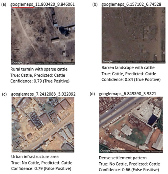 Some prediction examples on Nigerian satellite imagery showing model performance across different scenarios. Examples include true positives with varying confidence scores (0.79, 0.84) (a,b), successfully detecting cattle in rural and barren terrains, and false positives (0.79, 0.66) (c,d) incorrectly classifying urban infrastructure and settlements as cattle presence, demonstrating both capabilities and limitations in cross-domain transfer.