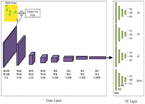 Although lower resolutions could improve computational efficiency, they reduce the system’s ability to resolve fine spatial details, especially for small gaps between objects or partially occluded surfaces. Reducing the resolution (e.g., to 64 × 64) can lead to poor grasping accuracy and increased decision errors due to the loss of visual detail. In contrast, increasing the resolution to 256 × 256 substantially increased memory and training time without significant improvement in task performance. Overall, 128 × 128 offers a practical balance between visual fidelity and computational cost, and it was empirically validated to support reliable closed-loop manipulation in our setup.