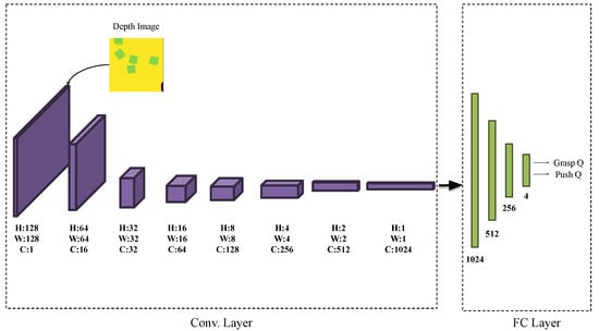 Based on the motivations mentioned above, this paper proposed a systematic approach to learning synergies between closed-loop grasping and pushing using behaviour cloning and deep reinforcement learning. The system is formulated as a two-layered hierarchy: The high-level decision neural network (DNN) decides whether grasping or pushing actions should be taken, whereas low-level action neural networks (ANNs) comprise the grasping network and the pushing network used to execute decisions. The DNN learns the coordination between pushing and grasping through deep reinforcement learning. Using a 128 × 128 depth image captured from the robot’s home position, the DNN outputs Q values for both actions. To enable closed-loop operations, the ANNs observe the current state and execute small adjustments (, , and ) each time. The grasping network moves the gripper tip to the desired grasping pose, while the pushing network directs it to the starting point of the push. The following are the contributions of this paper that helped us achieve the main objective.