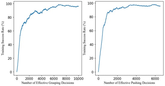 From a theoretical point of view, the adjustment steps chosen are small and discrete (e.g., ±0.015 m in /, ±0.02 m in , and ±7.5°/15° in ). This granularity enables incremental corrections at each time step; closed-loop feedback can help the network recover from minor interbranch inconsistencies or non-commutative effects over multiple steps. Empirically, this independent-branch design has proven effective. As shown in Figure 3, the grasping and pushing networks achieve training success rates of 98.6% and 97.8%, respectively, indicating that interbranch coordination emerges through learning despite the assumption of independence. Moreover, this design significantly reduces the dimensionality of the action space, improving sample efficiency and training stability.