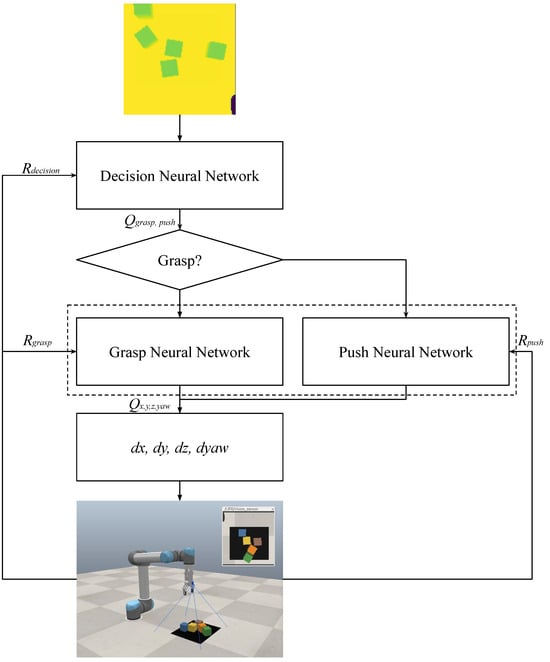 Figure 4 illustrates how DNNs cooperate with ANNs to interact with the environment. The DNN is the first layer of the system that selects between grasping and pushing decisions based on the Q values (Figure 2). If the decision is grasping, the grasping network is triggered; otherwise, the pushing network is selected. Both networks share the same architecture (Figure 1), and the adjustment is made based on the Q values in each branch. The selected low-level actions are transmitted to the robot arm for interaction.