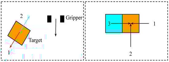 Grasping Trajectories: Figure 5 (left) illustrates how to compute the grasping trajectories, where the red line (1) and the blue line (2) represent two possible grasping orientations and the black line is the gripper orientation. Grasp orientation 1 is chosen because of the minimum angular difference between grasp orientation 1 and the gripper orientation. The grasping trajectory is computed on the basis of the bounding box’s centre and the chosen grasp orientation.