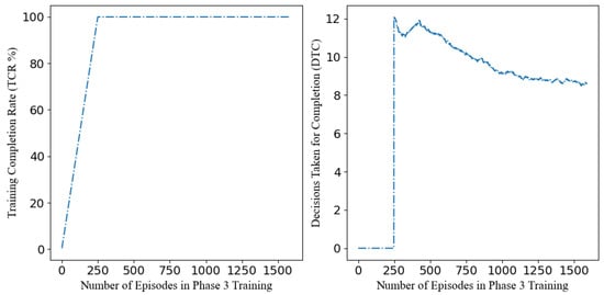 Decisions Taken for Completion (DTC): Equation (12) measures the efficiency of DNNs in completing an episode. is the number of successful episodes within the most recent 250 episodes, while is the number of high-level decisions to remove objects in the workspace.