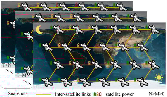 To construct a highly realistic simulation environment for more accurately evaluating the performance of energy-efficient routing strategies, we developed a dual-layer inclined orbital constellation model with 1152 satellites, based on the Starlink project’s publicly available constellation parameters []. These satellites are distributed over various orbits to simulate the actual satellite layout of Starlink, thus ensuring the practical application value of our simulation results. The deployment of ground stations is a crucial component of this simulation. We established 155 ground stations worldwide, considering a wide geographical distribution and actual communication demands to capture regional disparities in satellite communication system performance. The simulation process utilizes a fixed-duration snapshot method, with each snapshot lasting five minutes, covering a full 24 h day and generating a total of 1440 snapshots. An example diagram of snapshot transition states is shown in Figure 1. This approach enables us to meticulously document the satellite network’s performance variations throughout the day, providing substantial data for analysis. Static services are employed in this simulation. Such services persist continuously from the simulation initiation, and the number of concurrent services running in each snapshot remains stable. This setup enables observation of network performance under varying load conditions. For energy consumption simulation, emphasis is placed on the energy consumption status of satellite nodes when they are in the shadow zone. In contrast, when nodes are in the sunlight zone, solar power supply is adopted by default, and the battery-powered mode is not activated. All pertinent parameters, including satellite orbits, ground station locations, and other essential settings, are detailed in Table 1 of the paper.