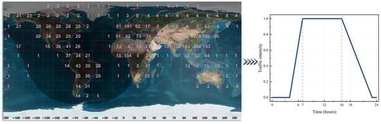A realistic global user traffic model is crucial for optimizing satellite optical network energy efficiency, especially for strategies like payload dormancy, because spatiotemporal traffic unevenness significantly impacts resource use and energy consumption. This unevenness, stemming from varied regional request intensities (due to population and development differences) and tidal network access across time zones, informs our spatial traffic distribution model. To create this model, Earth’s surface was divided into 288 equal areas. Traffic intensity in each area was primarily set using 2023 Internet user data []: one intensity unit per million users, with a one-unit baseline for areas with fewer users. Figure 1 shows this global traffic demand, marking intensities for 155 identified service-generating regions, where higher values mean more frequent network demands.