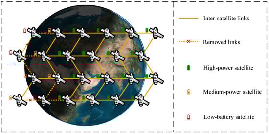 The problem is formulated by considering a series of consecutive operational snapshots, labeled . Each snapshot, , encapsulates the network’s physical connectivity, , and documents the unique residual battery levels for all satellites at that specific moment. Associated with each snapshot is a traffic matrix, , which remains consistent throughout its duration. The analysis further incorporates quantitative formulas to define satellite power consumption (Equations (2)–(5) and (16)–(19)) and battery life degradation (Equations (6)–(8)). This formulation is subject to several critical constraints: the total data flow on any link must not surpass its designated capacity (bandwidth limitation); the volume of traffic entering any satellite must equal the volume exiting, ensuring flow conservation; and the remaining battery capacity, , of any satellite must consistently stay within operational bounds (). The desired outputs of this problem are twofold: firstly, an energy-efficient network topology () for each snapshot, where represents the active network nodes and denotes the active links during snapshot , and secondly, a corresponding set of optimized service paths () for routing traffic within this energy-efficient topology. The overarching solution objective is to optimize key performance metrics across all snapshots. Specifically, for each snapshot period, the aim is to minimize the network’s overall life consumption (), packet loss rate (), and average service delay (), as collectively represented by the objective function in Equation (20), which seeks to minimize the sum of these metrics over all snapshots.