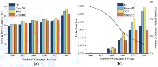 Figure 4a displays the average service latency caused by each algorithm under different numbers of concurrent services. The results indicate that the SP strategy generally exhibits the lowest average latency, as it consistently selects the path with the minimal propagation delay. However, as the number of concurrent services increases, the queuing delay caused by the SP strategy gradually rises, progressively diminishing its latency performance advantage relative to other algorithms. The GreenSR algorithm consistently shows higher latency in all tests, primarily because it does not fully consider network performance in topology planning, preferentially routing traffic to satellites with higher remaining battery, often resulting in detours that increase both propagation and queuing delays. The SGA achieves energy savings by optimizing network topology but does not consistently outperform SP and GreenRP across all service concurrency scenarios, revealing its latency performance shortcomings under high loads.
