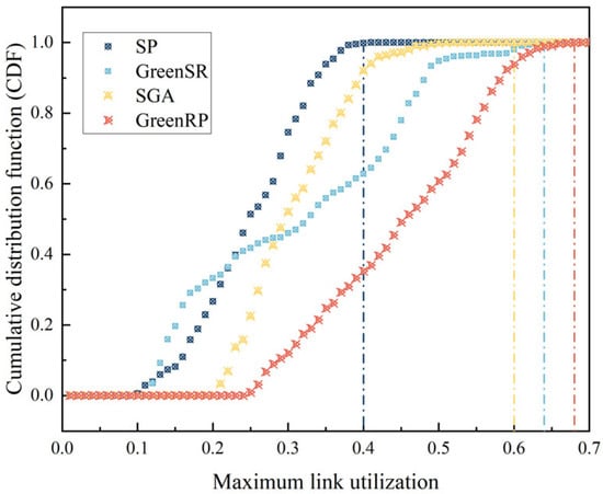 By calculating the average inter-satellite link utilization for each snapshot duration, data corresponding to 1440 snapshots were plotted as a probability density graph. Figure 5 illustrates the distribution of network-wide inter-satellite link utilization across various snapshot periods. With 24% as the baseline for link utilization, GreenRP’s rates were always above this level, whereas SP’s rates fell below this baseline about 52% of the time, and GreenSR’s about 38% of the time. The average link utilization for the SP strategy peaked at only 40% throughout the simulation period, primarily due to uneven traffic distribution with many links carrying low traffic volumes, resulting in low overall bandwidth utilization. GreenSR’s link utilization improved relative to SP, as dormant links were excluded from the utilization calculations, with fewer links handling communications. Additionally, GreenSR’s longer average service paths and the additional hops consumed more bandwidth resources. SGA generally exhibited higher link utilization than SP but did not consistently surpass GreenRP, particularly under high traffic conditions. GreenRP consistently demonstrated high link utilization rates. This indicates that by deactivating some links, GreenRP maintained high network-wide link utilization, thus efficiently utilizing communication resources.