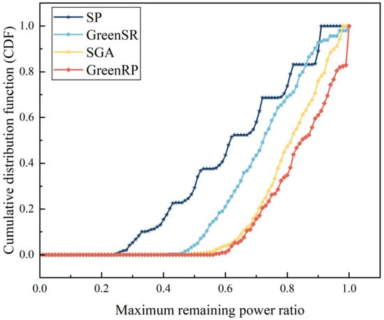 Figure 6 illustrates the distribution of the remaining battery percentage of satellites network-wide at the end of the simulation under various algorithms. Since some satellites were continuously exposed to sunlight, maintaining full battery levels, such data were excluded from the analysis. The graph reveals that the lowest remaining battery percentage network-wide under the four algorithms was 25% for SP, 43% for GreenSR, 49% for SGA, and 58% for GreenRP. This indicates that GreenRP performed best in maintaining higher battery levels across the network, effectively preventing excessive discharge of satellites. The steep curve of SP’s power distribution indicates uneven energy consumption among satellites in shaded areas, with some experiencing rapid battery depletion due to overuse, while others remain idle. In contrast, the smoother curves under the energy-efficient routing algorithms GreenSR, SGA, and GreenRP suggest a more balanced power consumption among satellites. This balance is achieved primarily by alternating the workload among different satellites. What is noteworthy about GreenRP is its optimized power management and load distribution. It ensures communication quality in shadowed areas while minimizing the number of operational satellites, thereby significantly improving satellite energy utilization.