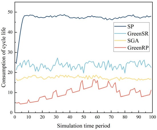 Figure 7 illustrates the network lifetime consumption produced by different algorithms. Every 100 min, data on network lifetime consumption by each algorithm were recorded, with the x-axis representing the time segment number and the y-axis the total network lifetime consumption for that period. Using 24 h simulation data, we estimated network lifetime, considering the lifetime of the entire constellation as a whole, with a fixed amount of life consumed every 24 h. It is assumed that the service life of the satellite network under SP is five years, and its reliability is calculated based on the simulation results. GreenRP could extend the lifetime to 13.8 years. The enhancement in network lifetime by GreenRP was substantial, showing an increase of 176% over SP, 80% over GreenSR, and 33% over SGA, and the improvement of this indicator is based on the premise that the network quality has not declined significantly. This further proves that when designing and operating satellite networks, the SP strategy consistently shows a higher network lifecycle consumption rate in all periods compared with energy-saving strategies. It further indicates that the temporal variation in traffic distribution is crucial for optimizing network lifespan and efficiency. Otherwise, just like the SP strategy, the consumption rate of network lifespan will remain at a high level regardless of changes in traffic demand, leading to unnecessary loss of network lifespan.