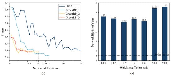 (a) Fitness iteration curve; (b) network lifetime metrics in relation to weight coefficients.