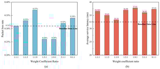 (a) Packet loss rate metrics in relation to weight coefficients; (b) average service delay metrics in relation to weight coefficients.