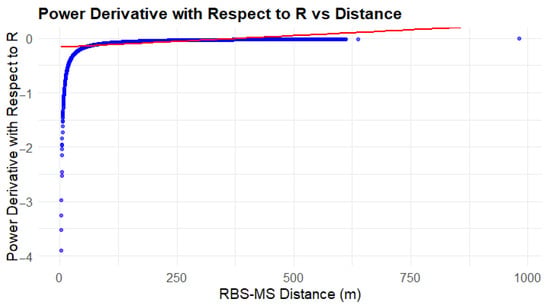 Following the procedure outlined earlier and using Equation (17), Figure 2 depicts the relationship between the partial derivative of power with respect to distance and the distance itself. In this figure, the blue points correspond to measured data, while the red line represents the modeled trend of power variation based on the derivative.