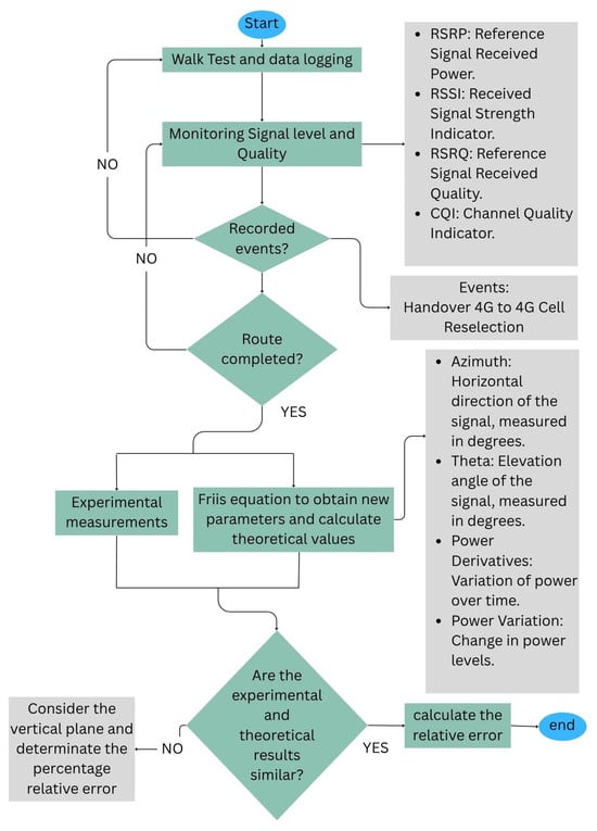 The flowchart illustrates the process undertaken to collect, process, and analyze data related to signal quality and events in telecommunications networks during a walk test. The procedure begins with data acquisition, followed by monitoring key indicators such as RSRP (), which measures the reference signal received power; RSSI (), an indicator of the overall signal strength; RSRQ (), which assesses the quality of the received reference signal; and CQI (), representing the channel quality. The collected data is then processed to derive additional parameters, including the azimuth (), indicating the horizontal signal direction; theta (), the elevation angle; power derivatives (), which capture the power variation over time; and power variation (), reflecting changes in power levels. Finally, a comparative analysis between the experimental and theoretical results is performed, calculating the relative error percentage to evaluate the accuracy of the model. The following sections provide a detailed description of each phase and the parameters involved.