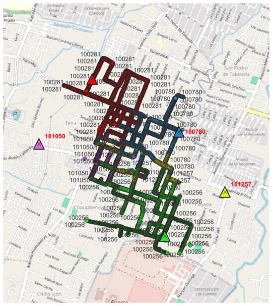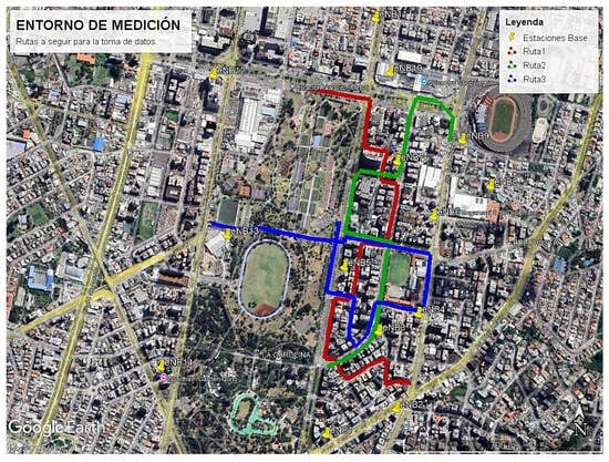 The set of routes was selected based on several key objective criteria: the density of mobile service antennas for the specific operator in Ecuador, the occurrence of handover events during the connection to enable mobility analysis, the feasibility of data collection on foot, and ease of transportation. The latter was ensured by placing the start and end points of each route near metro stations, bus rapid transit (BRT) stops, or urban bus terminals, facilitating operator mobility and optimizing the measurement process. Additionally, the routes were chosen to cover diverse urban morphologies, guaranteeing spatial diversity and comprehensive signal sampling across the study area.