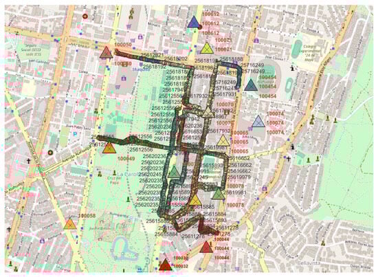 After compiling the cleaned dataset, the measurement routes were plotted in QGIS on a color-coded map according to their cell identifiers. Each triangle on the map represents one of the 14 base stations operating in the area, encompassing a total of 59 cells with useful information. The measurement points are colored based on their associated base station, as illustrated in Figure 7.