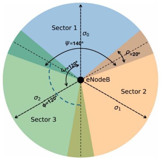 For simplification purposes, this study is conducted in two dimensions, considering only the gain in the horizontal plane. This approach is further justified by the fact that, in urban areas with high antenna density, network design prioritizes coverage extent and capacity over the range influenced by the vertical plane gain. Within this context, the transmitter gain in the horizontal plane is defined by Equation (4) []:
