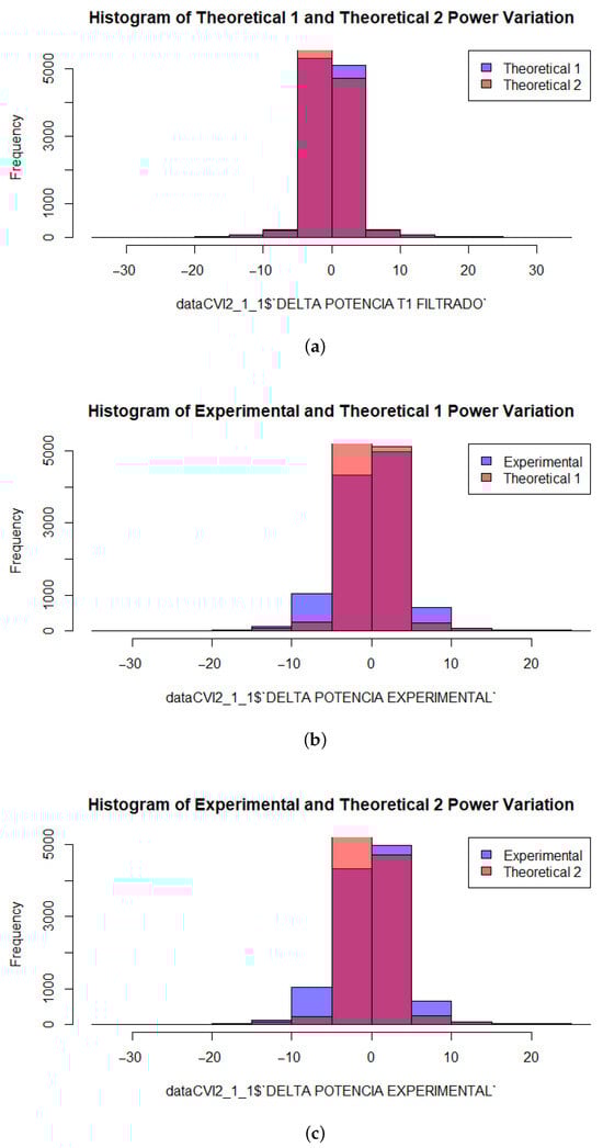 Comparison of the histograms obtained in the study. (a) Histogram of power delta—Theoretical Model 1 vs. Theoretical Model 2. (b) Histogram of power delta—experimental vs. Theoretical Model 1. (c) Histogram of power delta—experimental vs. Theoretical Model 2.