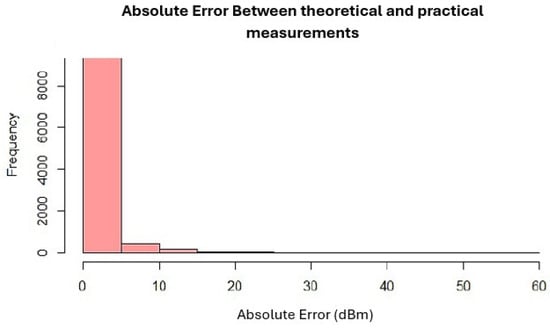 In contrast, Figure 12b,c illustrate the theoretical and experimental power variations, respectively. The overlay of these distributions shows generally strong agreement: most samples yielded an error of less than 5%, indicating that the proposed model successfully captured the overall spatial trends of the signal variation. However, certain discrepancies can be observed, particularly in about 4% of the data, where abrupt power fluctuations occurred. These deviations are mostly concentrated around inter-handover regions, changes involving invalid or non-existent cells, or areas affected by measurement artifacts introduced by the NetMonitor software (version 1.81). This particular version, commonly used for LTE signal diagnostics, may produce placeholder values or incomplete readings under certain conditions, especially during cell transitions or low-coverage scenarios. This highlights the importance of robust data preprocessing in future implementations to improve accuracy.