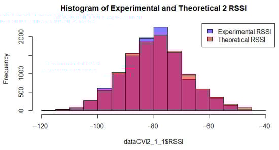 Following this approach, Figure 14 presents a comparative histogram illustrating the received signal strength indicator (RSSI) obtained experimentally using NetMonitor and the RSSI estimated by the proposed vector-based theoretical model. Both datasets exhibit a similar central tendency, particularly between  and , indicating that the model reliably approximates real-world signal behavior under average propagation conditions. This alignment is particularly evident in the urban scenario, where the base station density is higher and the propagation variability is somewhat reduced. However, the histogram also shows that the experimental RSSI values are more widely dispersed, especially toward lower power levels (e.g., below ), reflecting the influence of random environmental factors—such as shadowing from buildings, fast fading, and inter-cell interference—that are not fully captured by the theoretical formulation.
