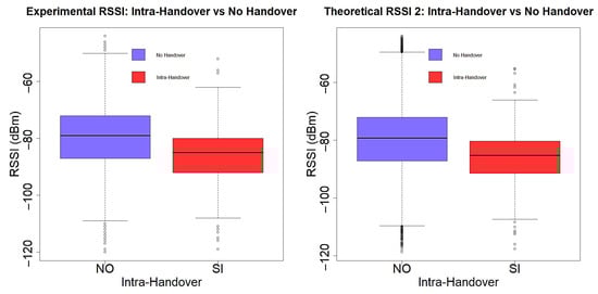 Furthermore, statistical validation through the analysis of variance (ANOVA) confirmed the significant impact of mobility events on signal strength. For the intra-handover process, the ANOVA test yielded a highly significant effect on RSSI values (). The Tukey post hoc analysis revealed a mean RSSI difference of  between the handover and non-handover conditions, with a 95% confidence interval of , clearly excluding zero. Similarly, for the inter-handover scenario, the effect on the RSSI was even more pronounced (), with a mean difference of  and a 95% confidence interval of . These results confirm that handover processes, especially inter-cell ones have a statistically significant and substantial impact on the received signal strength.